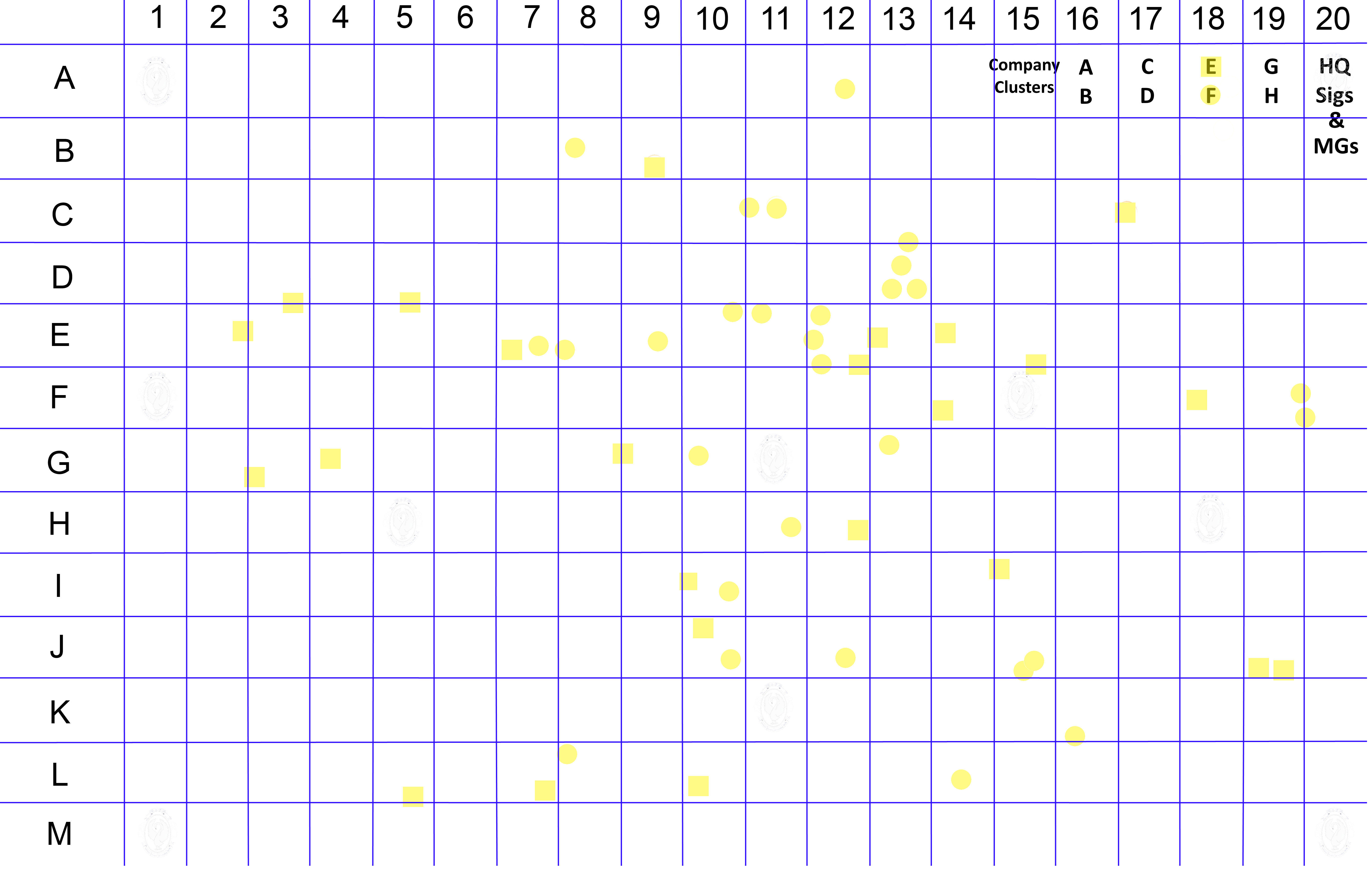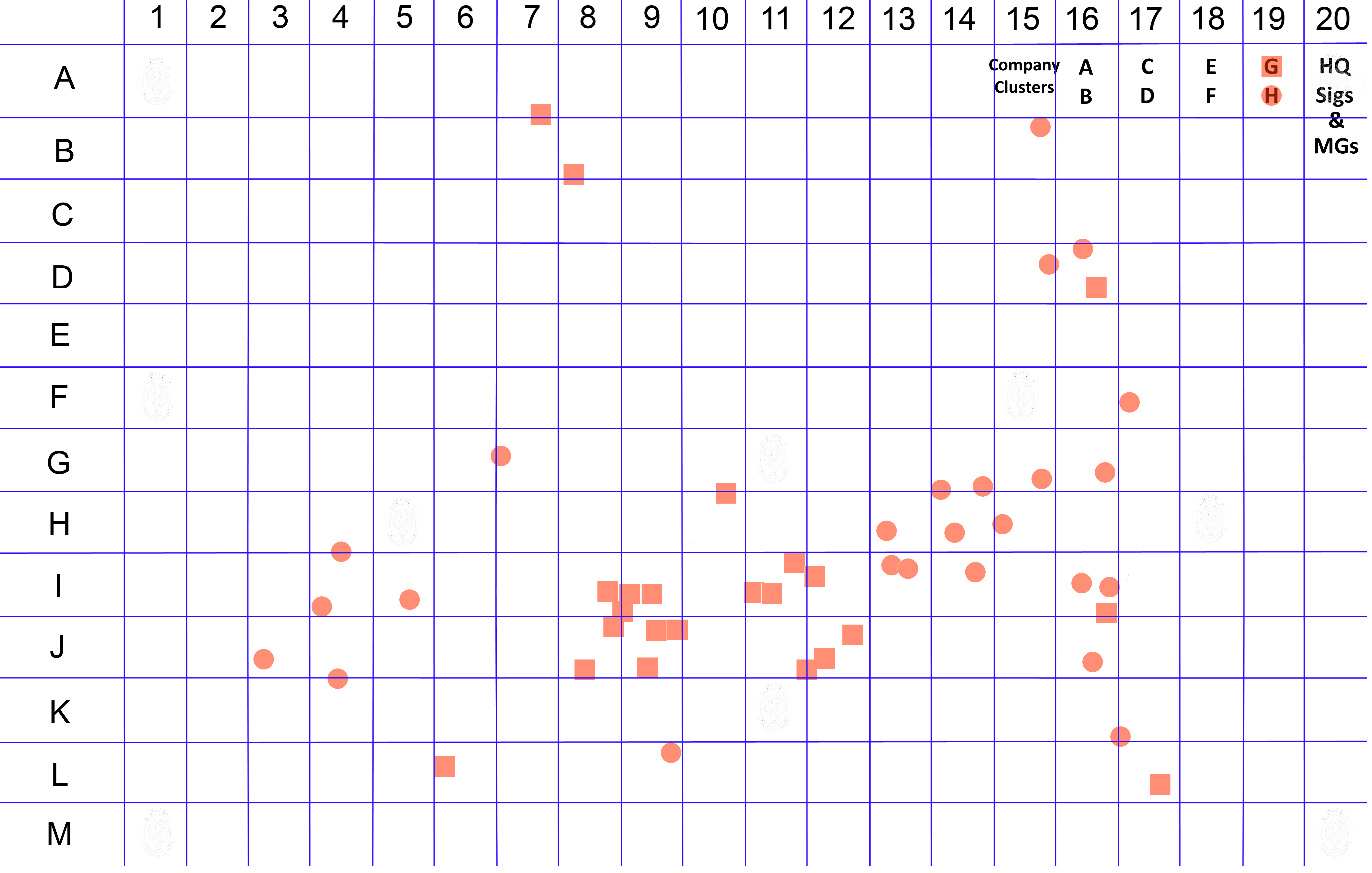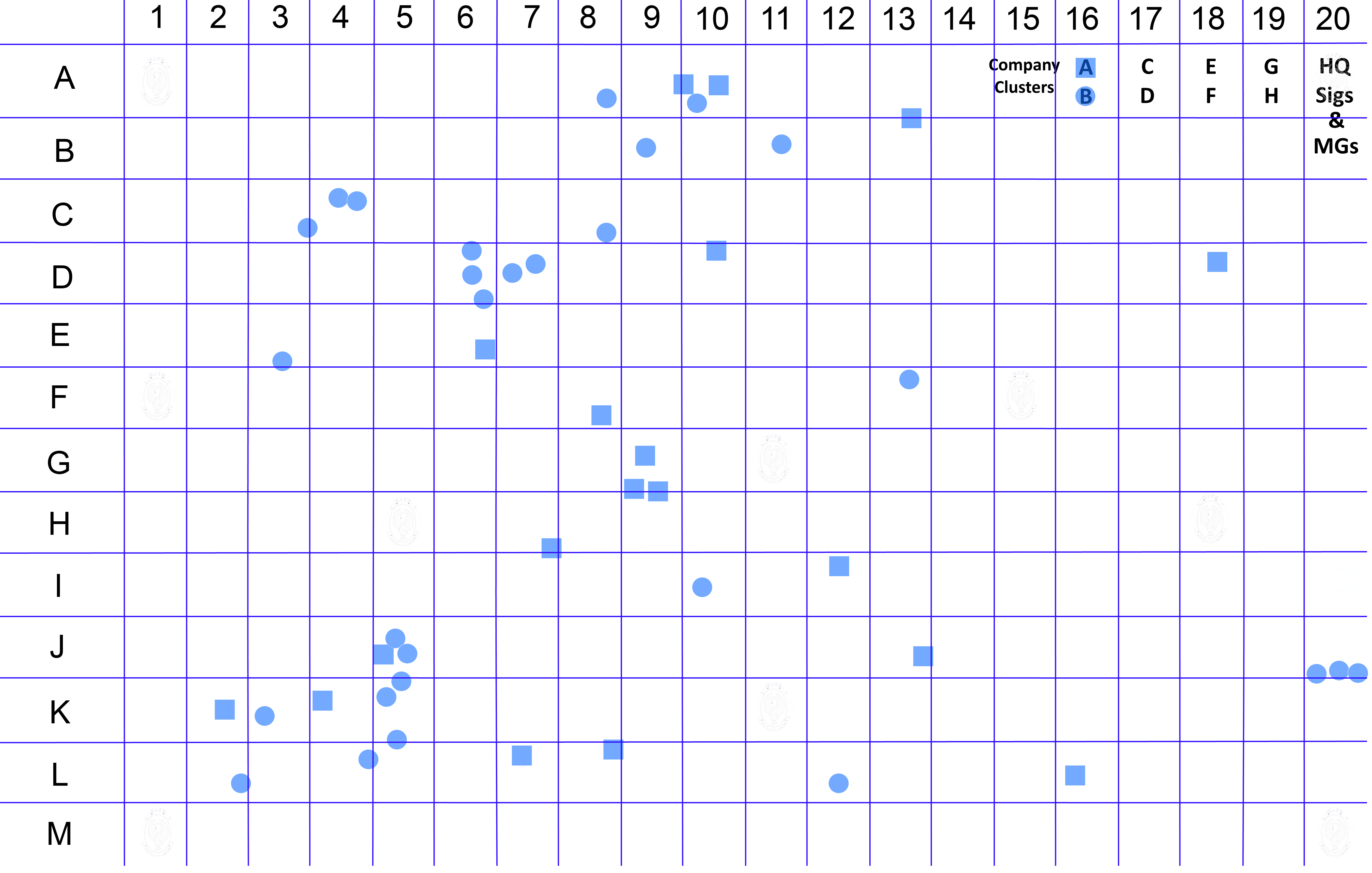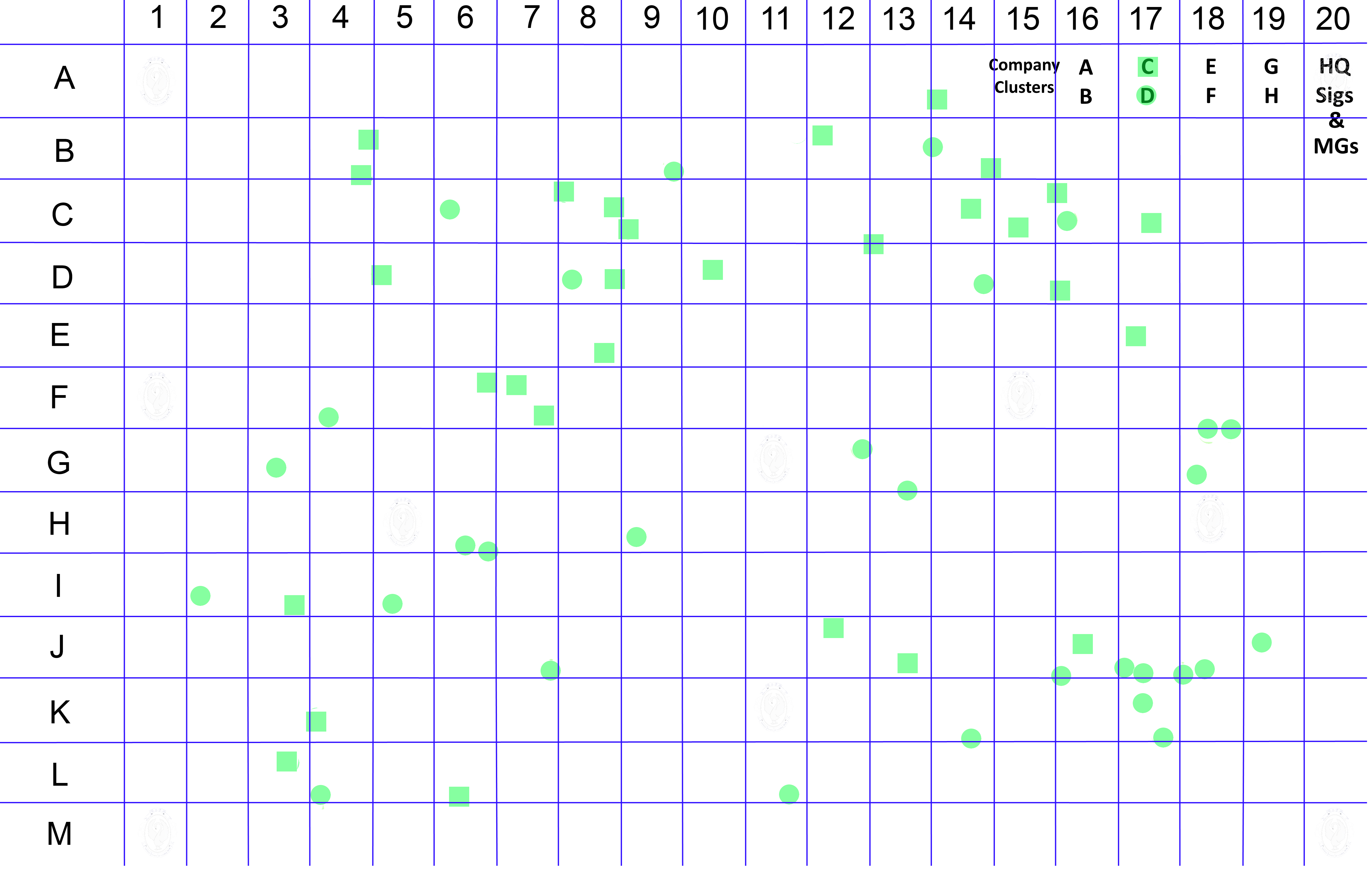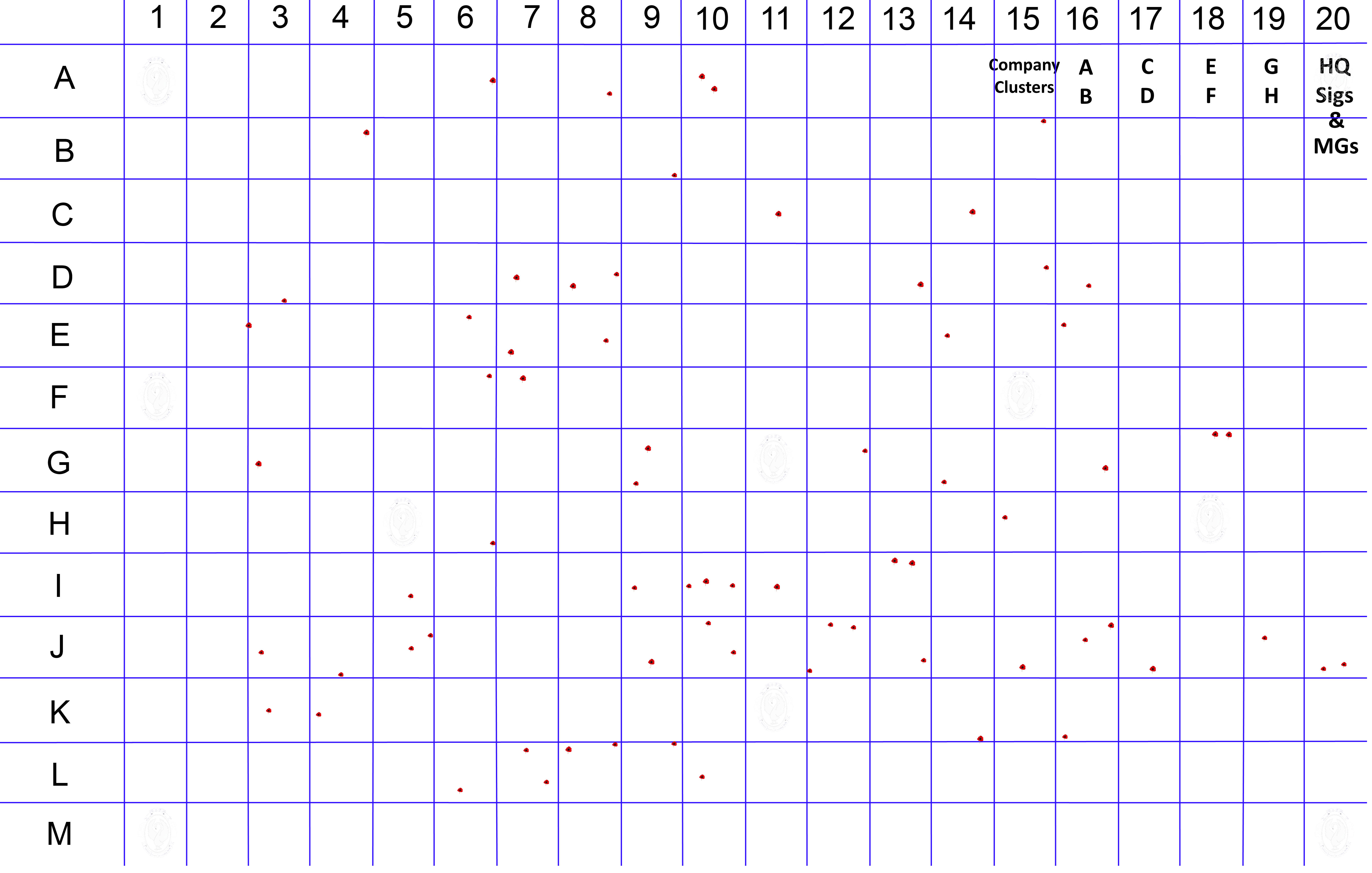 These cluster maps or infographics, show the identified soldiers locations via a colour patch according to their Enlistment Company, as shown in the Key to company diagram above.