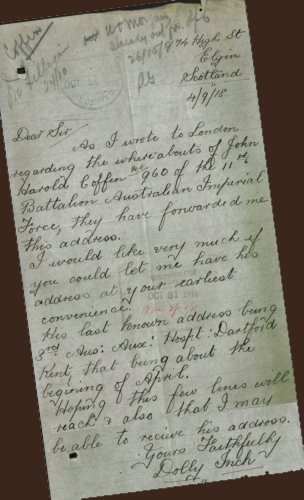 Amongst the documents in John Coffen's service record are two letters from a woman named Dolly Inch who resided at 174 High St, Elgin Scotland.