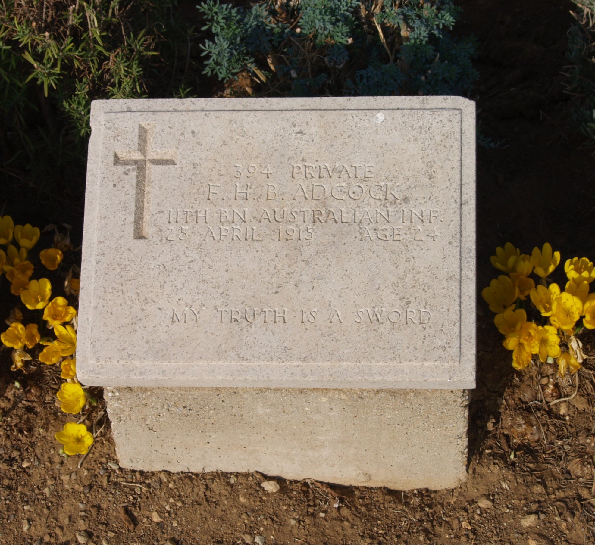 When the task came of reconstructing the Gallipoli War Cemeteries, members of the Imperial War Graves Commission made a search for battlefield burials and isolated graves were repositioned and bodies recovered. News eventually came through that Frank Adcock’s body had been recovered though records are scant on how and where he was found. He was then buried up at Baby 700 Cemetery in plot D.24, around other men who had fallen that first day of fighting. The men buried on either side of Frank; No.817 Maurice O’Donohue[xii] of the 11th Battalion and No.274 Leslie Clifford[xiii] of the 2nd Battalion had been found buried on or nearby Baby 700 and the same must have been true for Frank. As this ground was hotly fought over on day one and not occupied by the Australians after April 25th it’s a strong possibility that Frank was buried by the Turks after they had pushed the Anzacs back off Baby 700 for the final time. 493 men are buried in this cemetery but only 43 are known by name. Charlotte chose the following epitaph for Frank’s headstone;“My Truth is a Sword”